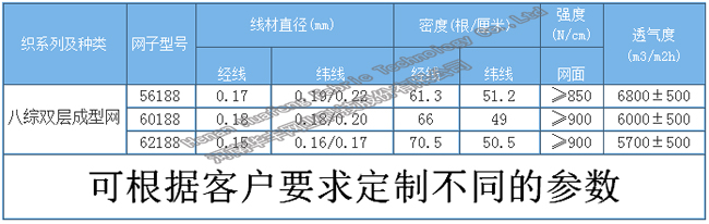 八棕雙層成型網(wǎng),成紙面均勻,成形效果好, 具有較高的縱橫向機(jī)械穩(wěn)定性,具有較好的脫水能力。